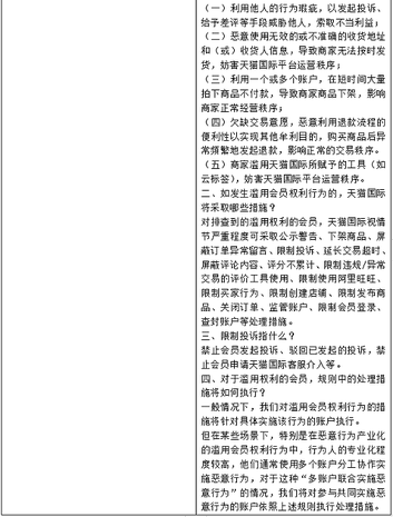 親愛的天貓國際商家: 天貓國際鼓勵消費者誠信購買,共同維護良好有序的網購環(huán)境。為了更好的維護天貓國際市場交易秩序,更切實的保障商家的合法權益,天貓國際將變更《天貓國際服務條款規(guī)則》中“不當注冊”的規(guī)則,同步新增“濫用會員權利”規(guī)則。 本次規(guī)則變更將于2019年2月27日正式生效。 具體變更內容如下:......